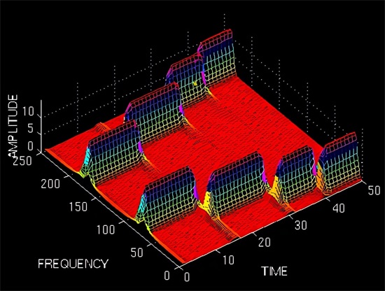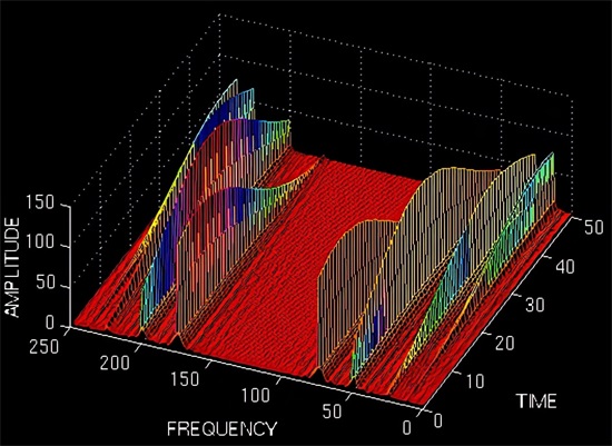 由上图可以看出,频率的分辨率比较好,但是时域分辨率差,有点接近傅里叶变换。由上图可以看到短时傅里叶变换的缺点。