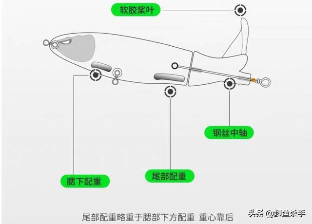 拟饵的前面部分要宽于后面,在拟饵鱼嘴处有个铁环,是用于链接主线,假饵眼睛做了明亮处理。鱼肚下腹和鱼尾处有铁环,是用于外挂鱼钩。在鱼尾处是做分段式设计,鱼尾设计成了一个可旋转的螺旋桨,在水面搜索时发出噪音。拟饵拖拉机饵体里面,装有配重设计。