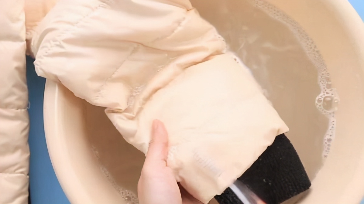 在清水里滴入一瓶盖的食用米醋(白醋),把羽绒服放在里面浸泡5-10分钟,大致揉搓一下,可不用过水,将醋水撇去后悬挂晾干。
