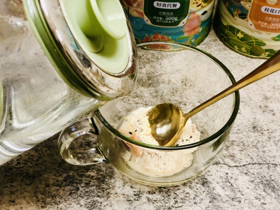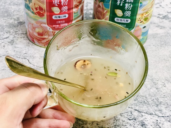 除了水温之外,藕粉和水的比例也很关键,水多了容易成稀水,水少了又容易成一坨,判断藕粉和水的比例其实非常简单,先把藕粉放到杯子里,然后加入没过藕粉1-2厘米的开水就可以了。