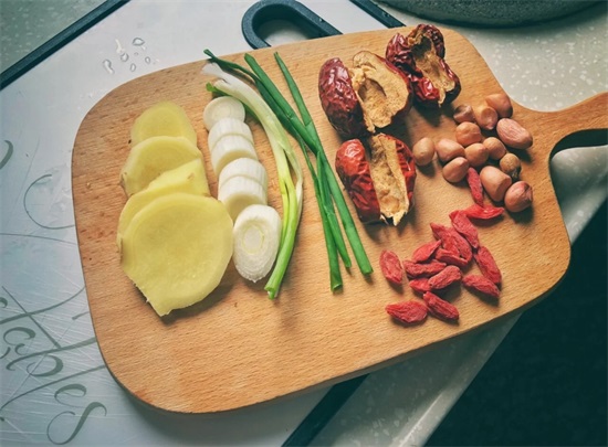 1、葱,姜,洗净,切片切段,红枣的核是上火的,一定要去掉,枸杞和花生不用很多。