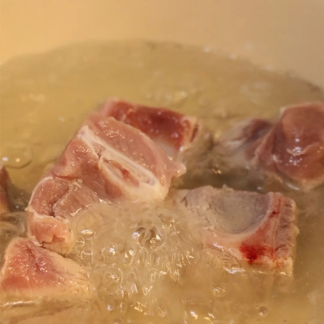 1、汤锅中加入适量的清水,将洗净的肋骨放入加热沸腾捞出用清水冲凉备用。(这样有助于在最后炖煮出清澈的靓汤哟。)