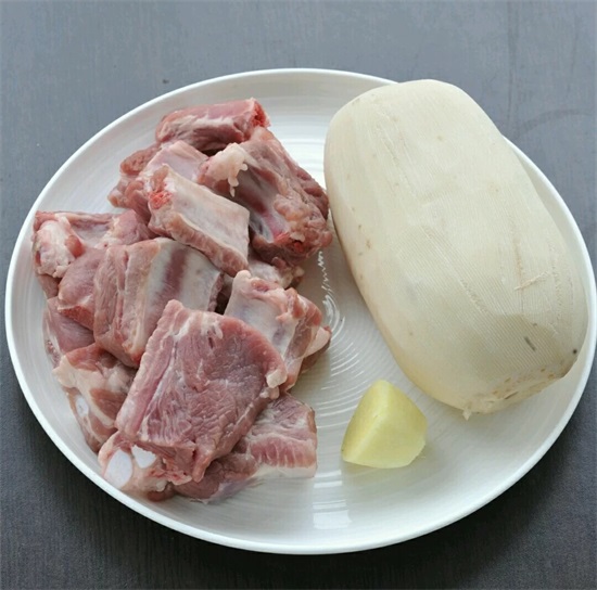食材以及调味料的准备:莲藕(2段)、肋骨(500g)、花生(3汤匙)、姜(1拇指)、食盐(2茶匙)、水。