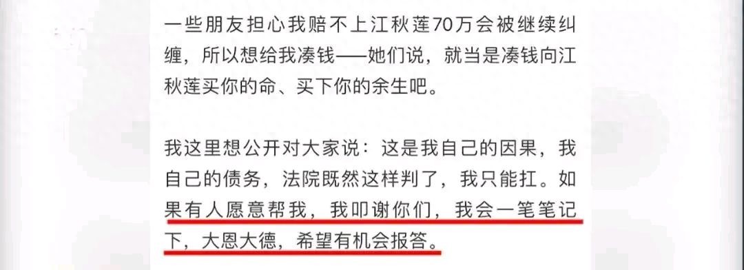 文章的大致内容是,既然法院判我败诉,那我只能认命,但是这个赔偿款,我是真的赔不起,希望广大网友能够积极给她捐款,让她能有钱还给江歌母亲。