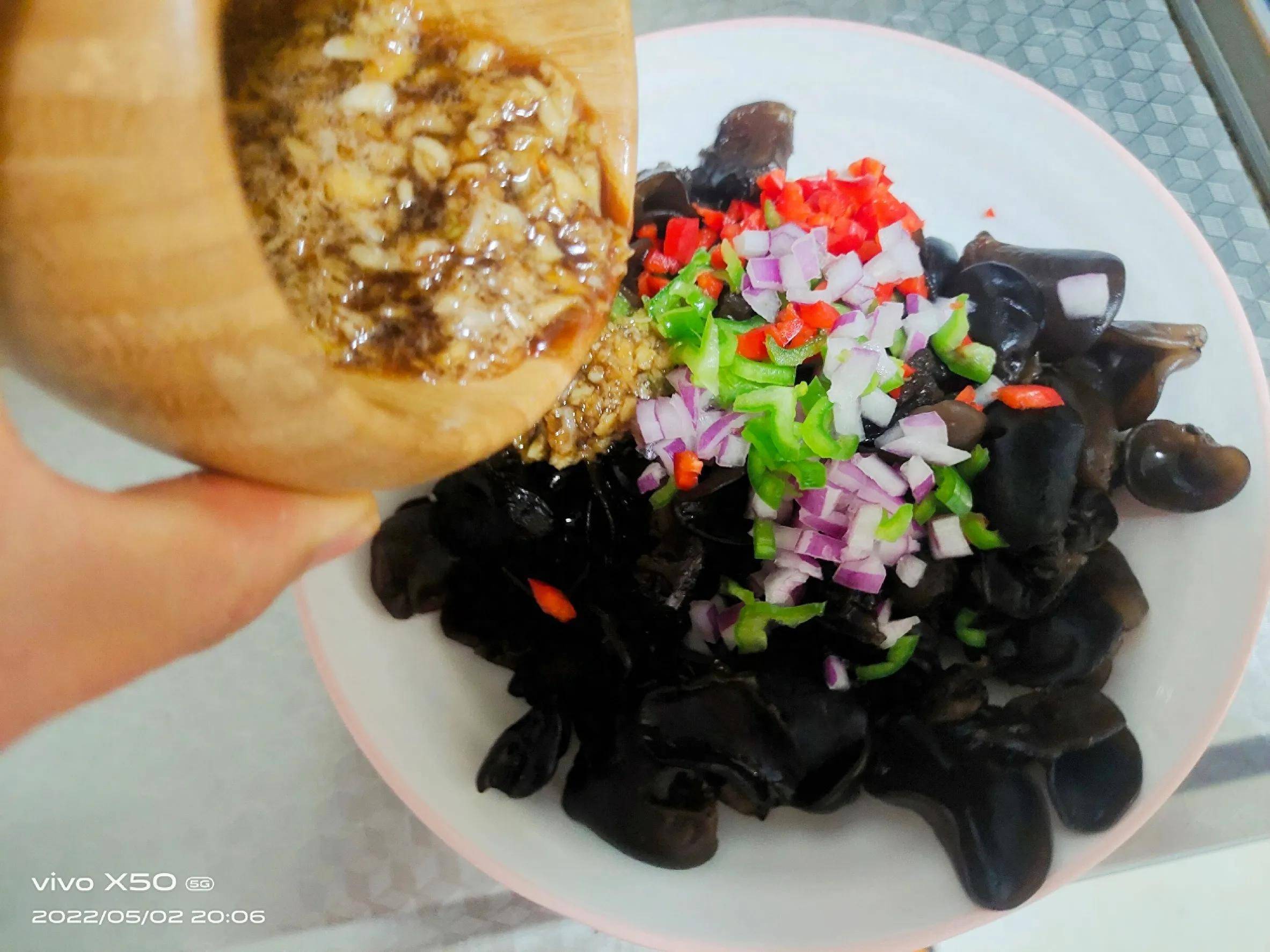 食材:干木耳一小把,青红椒各一点,洋葱一点,大蒜五瓣。