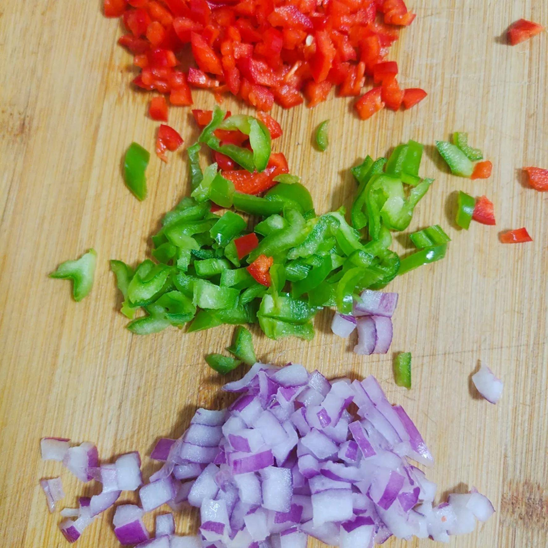 (3)把青红椒,洋葱分别切成小粒备用