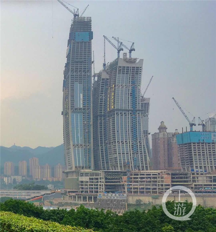 在建的重庆来福士广场超高层塔楼,外立面均为弧线造型,像一座风帆,因此也叫“朝天扬帆”。由8幢塔楼、底部裙楼及一座空中“水晶连廊”组成,涵盖高端住宅、购物中心、办公楼、五星级酒店及服务公寓五大核心业态。其中4幢塔楼,由中建八局西南公司承建。