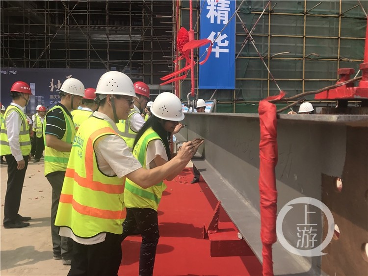 上午,建设者们在最后一榀钢梁上签名、留影,纪念这个难忘的时刻。10点半,最后一榀钢梁正式起吊,3吨重的钢梁,升上350米高空,仅花了3分钟。