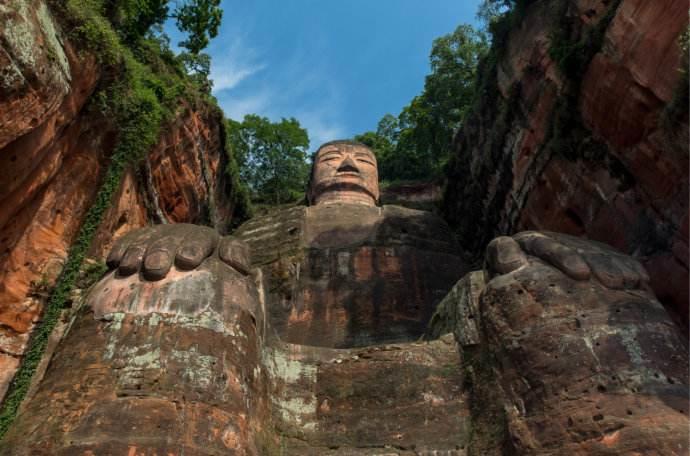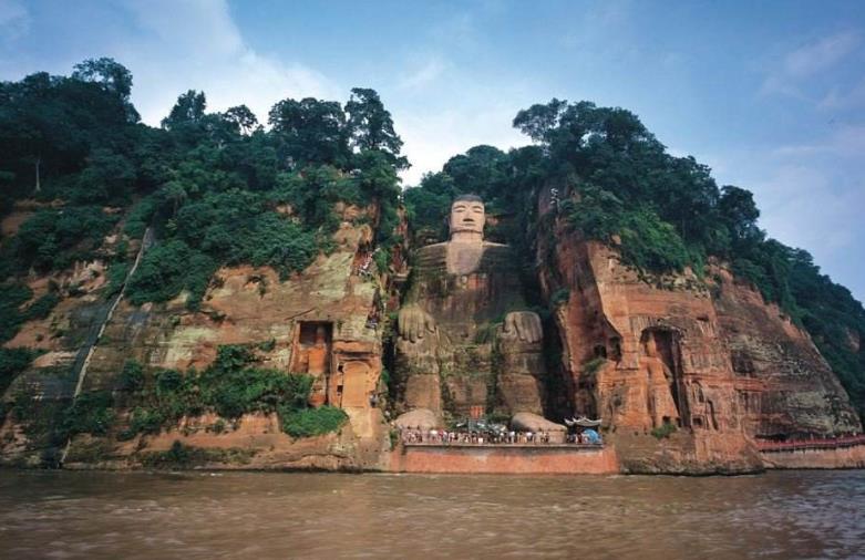 位于四川省乐山市南岷min江东岸凌云寺侧的乐山大佛,整座佛像雕刻在悬崖之中,高约71米,是弥勒佛坐像,是中国最大的一尊摩崖石刻造像。在大佛的左右两侧沿江崖壁上,还有两尊身高超过16米的护法天王石刻,与大佛一起形成了一佛二天王的格局。