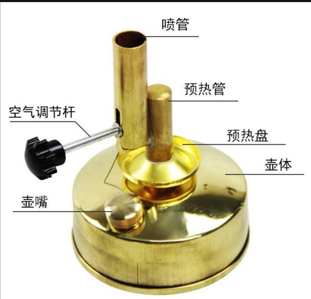 3)当喷口火焰点燃后,再通过空气调节杆调节进气量,使火焰达到所需的温度。在一般情况下,进入的空气越多,火焰温度越高。4)熄火 停止使用时,可用石棉网或废木板平压覆盖喷管口,灯焰一般即可熄灭。覆盖管口的同时也可用湿布冷却灯座并调大进气量以熄火。稍后,垫一块布(防烫伤)拧松壶体上的旋塞(铜帽),使灯壶内的酒精蒸气放出。