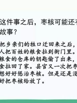 枣核把乡亲们的牲口迁回来之后,县官又命令手下人把百姓的粮食拉到衙门里。枣核又想法把装粮食的仓库的钥匙偷了出来,组织乡亲们把粮食拉回了家。县官又一次把枣核捉拿到县衙,想好好惩治枣核。但是还是没有得逞。没办法只好把枣核给放了。