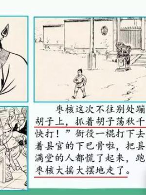 c.枣核这次不往别处蹦,一蹦蹦到了县官的胡子上,抓着胡子荡秋千。县官直喊:“快打!快打!”衙役一棍打下去,没打着枣核,却打着县官的下巴骨啦,把县官的牙都打了下来。满堂的人都慌了起来,跑上前去照顾县官去,枣核大摇大摆地走了。