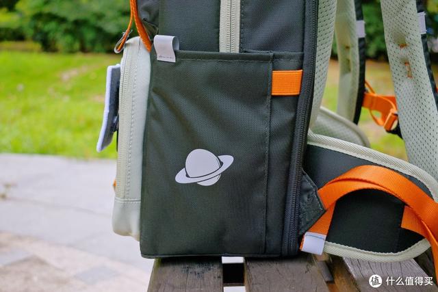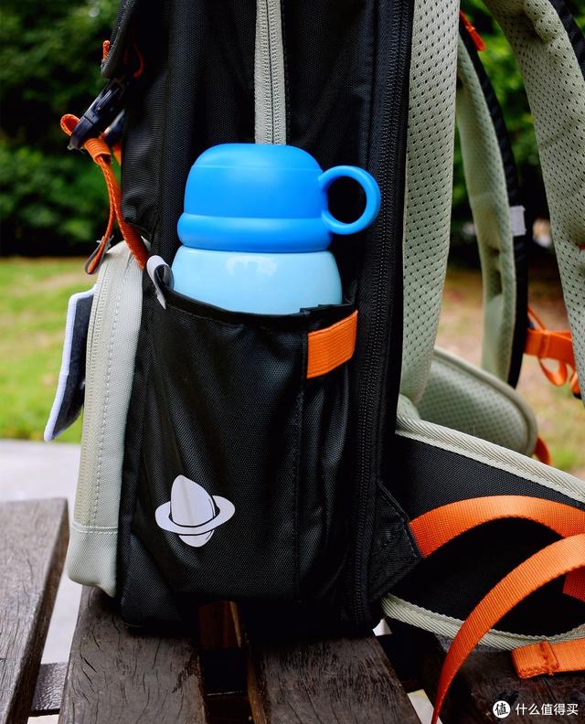 在侧袋里放置孩子平日使用的600ml大号水壶,没有任何问题,口袋比一般书包较深,不怕水杯掉落。