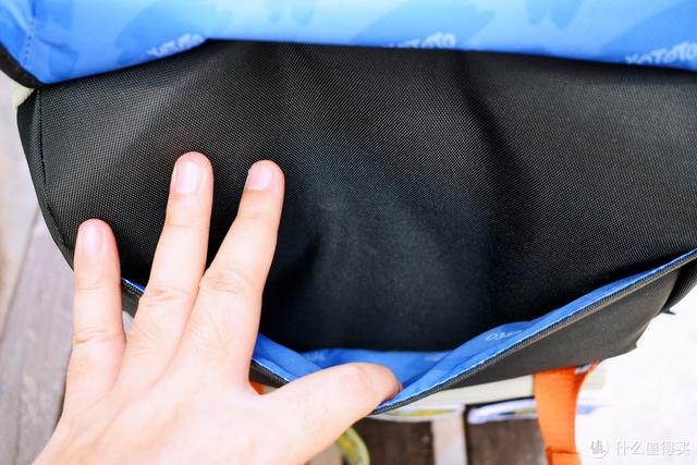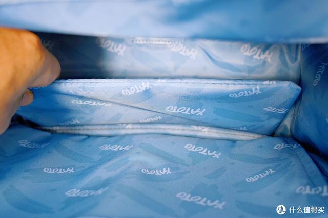 书包大开口的设计,方便孩子取用书本、衣物。蓝颜色的内衬看着就清爽,不会像那些内衬一抹黑的书包,里面黑咕隆日本咚,找起书本来一点也不方便。