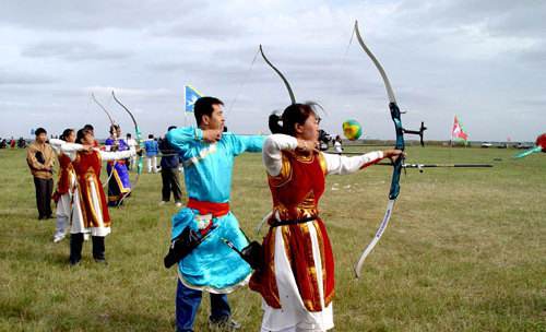 射箭是蒙古男儿“三艺”之一,射箭分静射、骑射、远射三种。静射即站立射靶;骑射,射手骑马奔跑中发箭,参赛者自备马匹弓箭,其样不限。比赛规则是中靶箭数多者为胜。《元史.兵志》载:“元起朔方,俗善骑射,因以弓马之利取天下。”