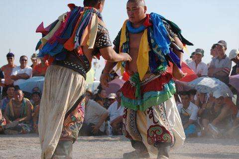 摔跤手所穿的“昭德格”以及套裤和皮靴上,常缀以象征吉祥和壮观的金银饰件。摔跤手在伴唱的摔跤歌声中,以狮子舞步或鹰舞的姿态跳跃出场,绕场一周,向来宾和主持人合掌致意,摔跤手双方也以礼相会,然后由裁判员发令,开始比赛。比赛者不分体重大小,不受时间和场地限制,均采用淘汰赛,一跤定胜负。胜者欢舞跳跃,败者则不许再上场。