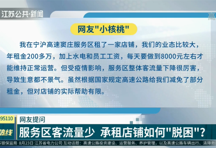 网友“小核桃”反映:他在宁沪高速窦庄服务区租了一家店铺,年租金200多万,加上水电和员工工资,每天要做到8000元左右才能维持正常运营。但受疫情影响,服务区整体客流量下降很厉害,生意都不景气。