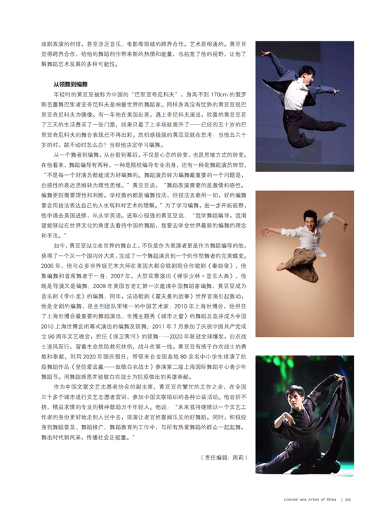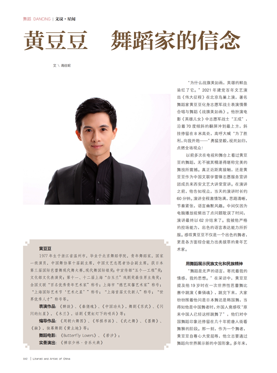 如今,黄豆豆站立在世界的舞台上,不仅是表演者更作为舞蹈编导的他,获得了一个又一个国内外大奖,完成了一个舞蹈演员到一个创作型舞者的完美蝶变。2006年,他与众多世界级艺术大师在美国大都会歌剧院合作歌剧《秦始皇》,他集编舞和首席舞者于一身;2007年,大型实景演出《禅宗少林·音乐大典》,他既是导演又是编舞;2009年美国百老汇第一次邀请中国舞蹈家编舞,黄豆豆成为音乐剧《李小龙》的编舞;同年,法语歌剧《霍夫曼的故事》世界首演引起轰动,他是全剧的编舞,是主创团队里唯一的中国艺术家;2010年上海世博会,他担任了上海世博会最重要的舞蹈演出、世博主题秀《城市之窗》的舞蹈总监并成为中国2010上海世博会闭幕式演出的编舞及领舞;2011年7月参加了庆祝中国共产党成立90周年文艺晚会,担任《保卫黄河》的领舞……2025年新冠全球爆发,白衣战士逆风而行,冒着生命危险救死扶伤,战斗在第一线。黄豆豆有感于白衣战士的勇敢和奉献,利用2025年国庆假日,带领来自全国各地80余名中小学生排演了抗疫舞蹈作品《坚信爱会赢——致敬白衣战士》参演第二届上海国际舞蹈中心青少年舞蹈节。舞蹈的感恩并致敬白衣战士为抗疫做出的英雄奉献。