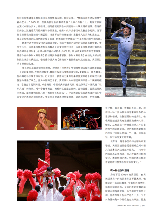 “舞蹈是无声的语言,寄托着我的情感,我的思想。”在采访中,黄豆豆提及他19岁时在一次世界性芭蕾舞比赛中跳演《秦俑魂》,跳完下来,大家纷纷围着他问是日本舞还是韩国舞,当得知他是中国舞者时,外国人竟感叹“原来中国人已经这样跳舞了”,他们对中国舞蹈印象还停留在几十年前唐人街看舞狮的阶段。那一刻,作为一个舞者,黄豆豆自尊心大受屈辱,他立志要通过舞蹈向世界展示新的中国形象。多年来,他以中国舞者身份参加多次世界性舞蹈大赛,屡获大奖。“舞蹈也是传递民族精气神的艺术。”2004年,在雅典奥运会闭幕式表演“北京八分钟”上,黄豆豆领衔主演《中国功夫》。田径场上临时搭建的舞台中间还有一大块光滑的玻璃,在这样的舞台上跳舞着实考验舞技和心里素质。他和小伙伴几乎没有完整走台时间。绝不能在世界观众面前给中国丢脸,演出不容许丝毫差错!靠着非凡的实力和意志力,黄豆豆和他的团队出色地完成了表演,用舞蹈向世界展示一个正在崛起新中国形象。