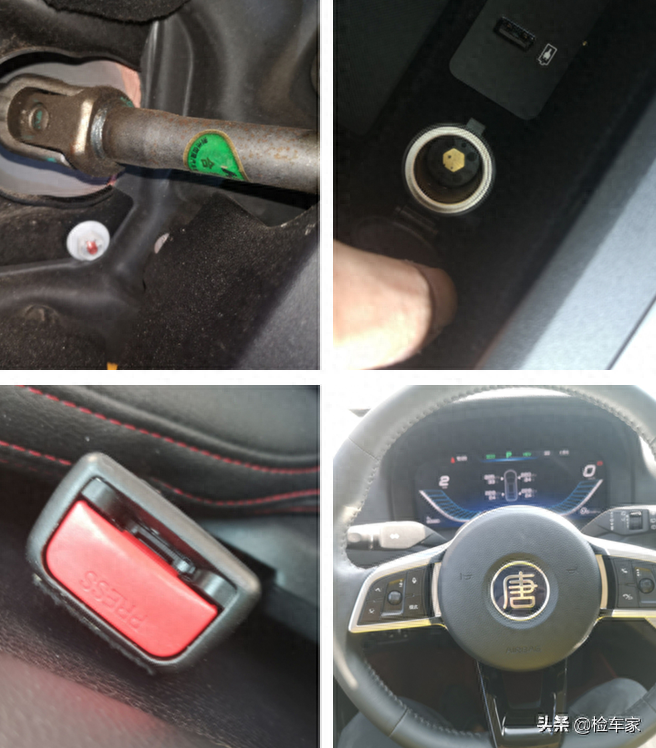 转向柱部分、车辆的点烟器、安全带卡扣处也并未发现有明显的锈蚀情况,可以判断车辆并未有水泡的情况,同时车辆的方向盘部分并未发现有明显的磨损以及翻新的情况。