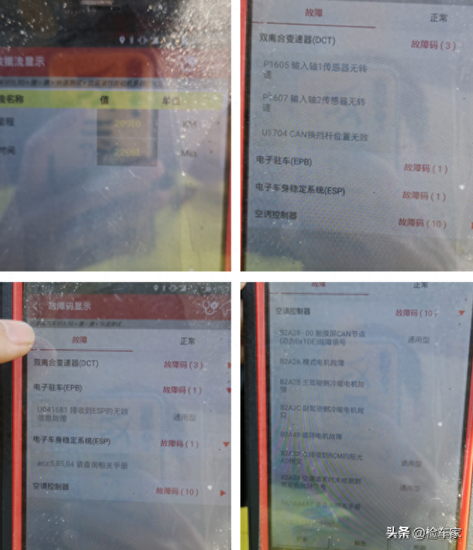 接着我们就转到了车辆的OBD检测部分了,首先我们先读取下车辆的公里数,这里可以看到上面的数据跟表显的差距不大,而且下面也有发动机的运行时间22001分钟,推算一下也还是能知道一个大概的,此时我们结合内饰情况可以判断车辆并未有调表的情况。接着我们看下车辆的故障码,这里看到变速箱部分存在故障码,这里后期需要去检测一下,这个是传感器部分的故障,车辆ESP及EPB部分也同样存在故障码,但是具体的话应该也是传感器的问题,接着空调部分存在的故障码还是比较多的,但是我在测试的时候,空调制冷情况还是没啥问题的。