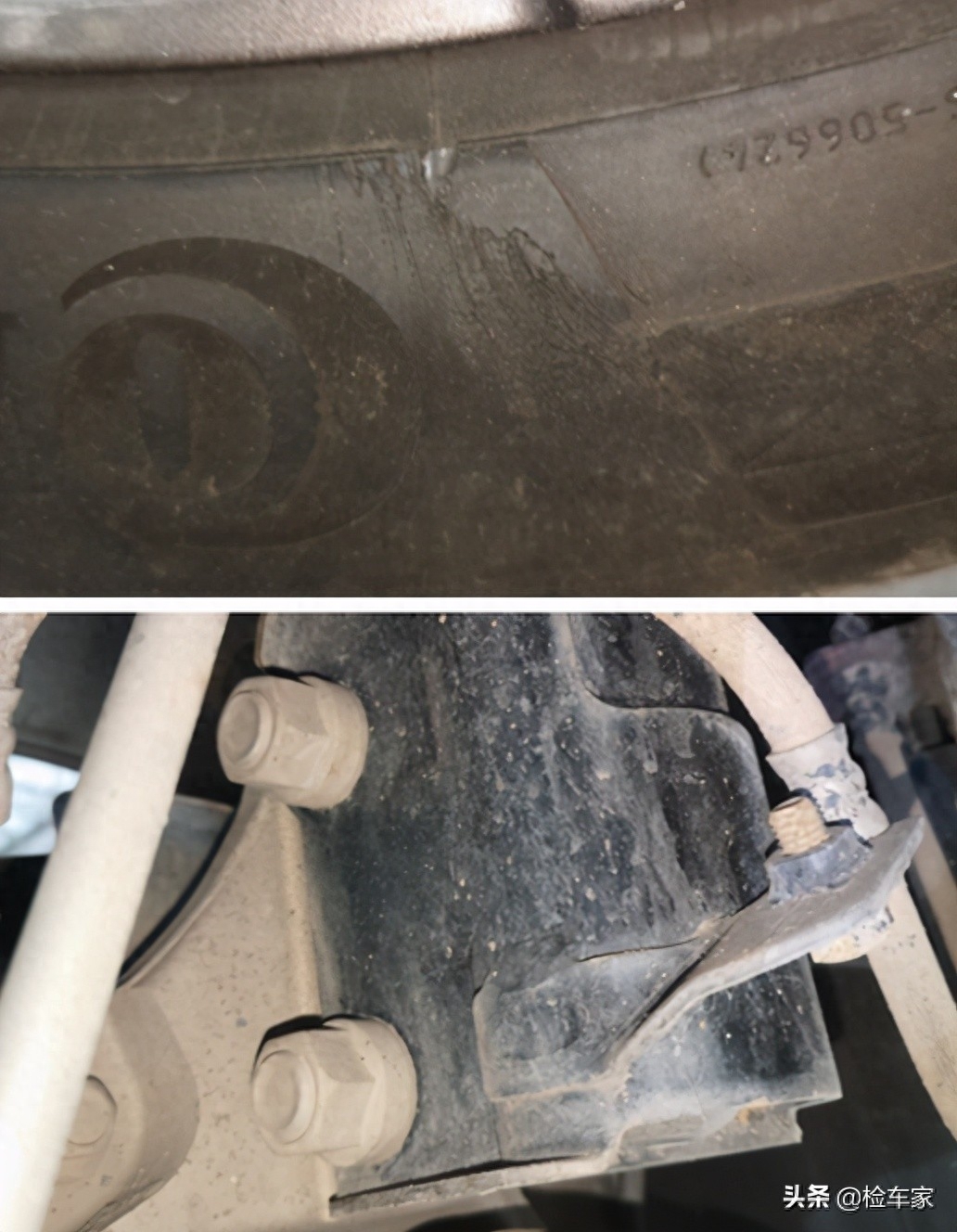 我观察了下,车辆确实剐蹭轮胎边缘的情况比较多,这个新换的轮胎上面也都发现了剐蹭的痕迹,看来平时开始也不太在意啊。减震器部分检测,并未发现有明显的拆卸痕迹。