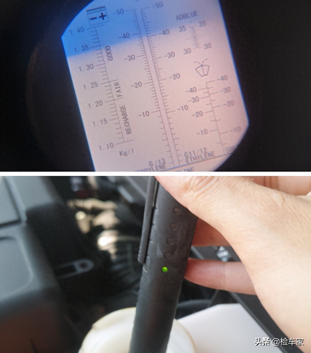 接着我们看看全车油液部分,这车的机油加注口设计在空气格下面,现场没有工具的情况下,我没法拆卸去检测,我们只能看下冷却液部分,这里可以看到,这里冷却液的冰点在规定的范围之内,刹车油部分检测,也并未发现有明显的变质情况,说明油液部分回去并不需要整备。发动机部分检测下来也没啥太大的问题,我们去看看内饰的情况。