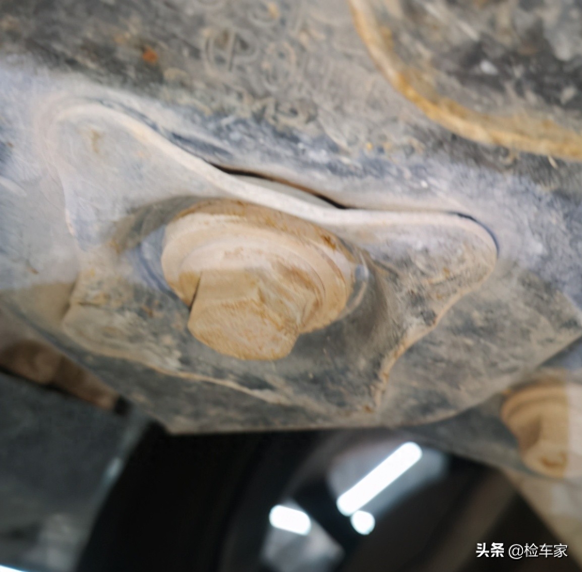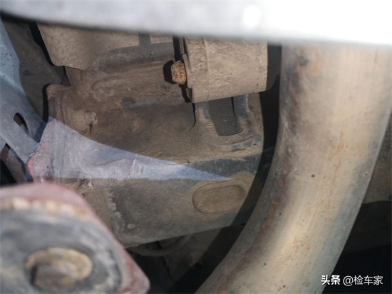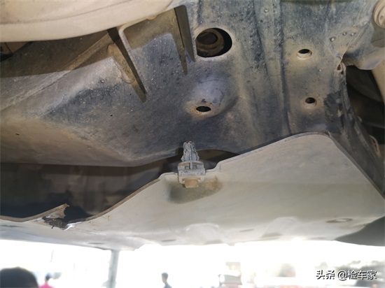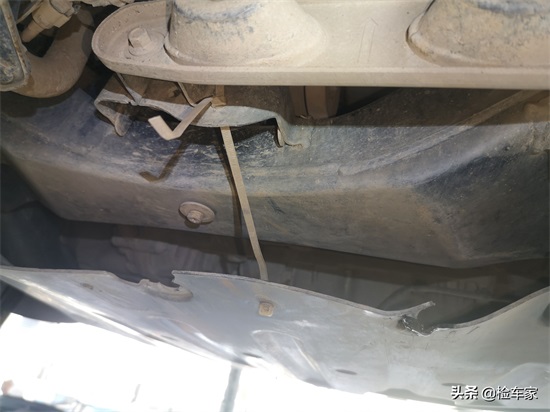 接着我们就到车辆底盘部分检测了,这里就可以看到车辆发动机下护板有明显的托底情况,说明车辆行走的路况可能不是很好。