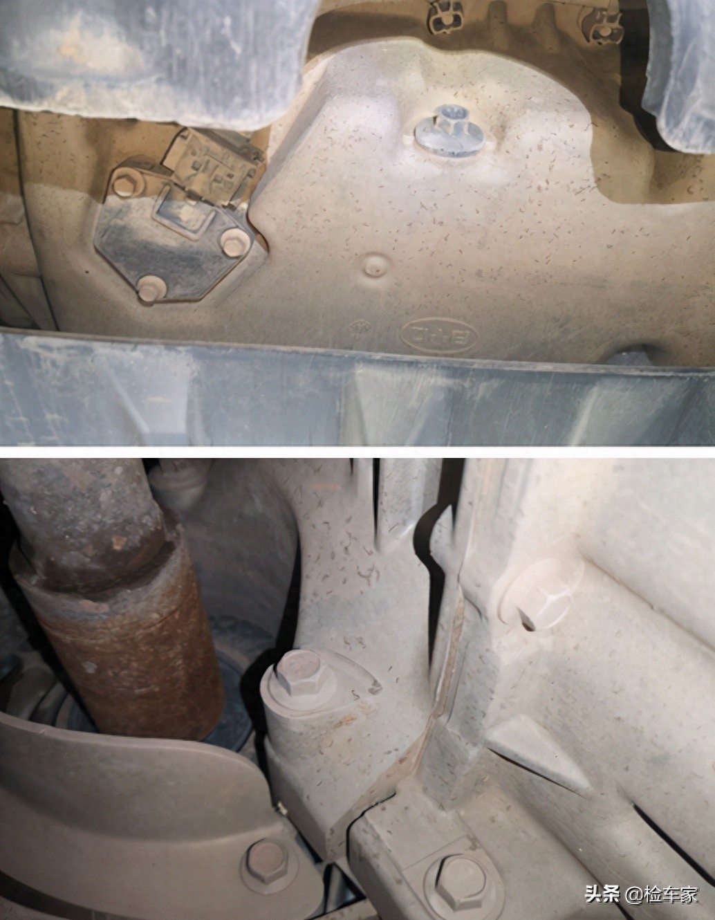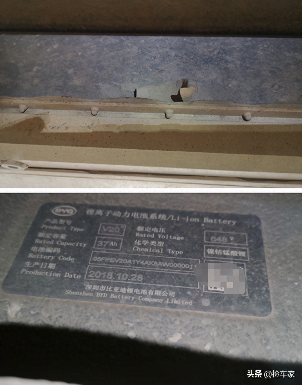 为啥这样说,我之前也说了我看了好几台唐DM了,电池组的这个位置,是有一个生产日期的贴条,但是这个车的贴天已经被腐蚀脱落了,上面的时间都看不到了,而且电池组部分的泥沙也多。图中下方那个图就是真相,这个贴条的车也是同款车,也是同样公里数的电池组部分的贴条,大家一看就知道车辆的差距了,看来这次检测的这个车行驶的路况确实差了点。