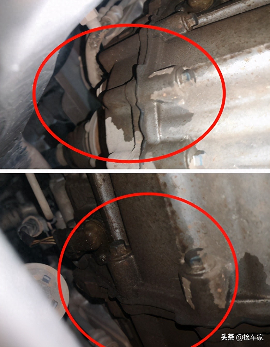 但是检测到变速箱部分的时候,就发现了存在了漏油的情况,这个才2万公里就漏油了,这个做工是不是差了点啊?咱们再换个角度观察,可以看到油是从传感器部分渗漏下来的,而且情况不容乐观,后期需要及时处理了,这个漏法,估计变速箱油顶不了多少久的,比较机油少还能添加,但是变速箱油少了添加起来就比较麻烦了。