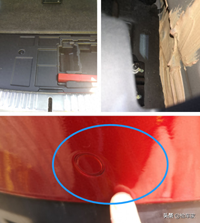 接着我们来到后备箱内部,看看它是否跟其他东西有亲密接触:后围板部分检测,并未发现有明显的切割或者后期修复痕迹,上面支架的螺钉安装记号也并未有动过的痕迹,而且后围板部分打胶也符合原厂工艺。不过到了后杠部分,我们终于发现了车辆喷漆修复的痕迹了,上面的雷达探头都被飞漆包裹住了,而且整个后杠的”橘皮“现象比较明显,这都说明是后期修复过的,但是后围板部分并未发现有变形,这里应该也是轻微刮碰导致的。