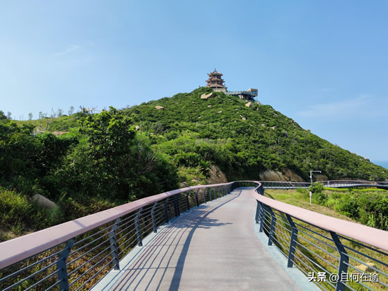 来到蜜月山一定要登上蜜月阁,山不高,但应该是东澳岛最高处了,现在建有环山栈道,很休闲,走在栈道上如穿行于绿色世界里,这个岛屿的绿植很好,到处都是高大茂盛的大树,直到中间时,往后望,黄红色的栈道好像延伸到大海里了。