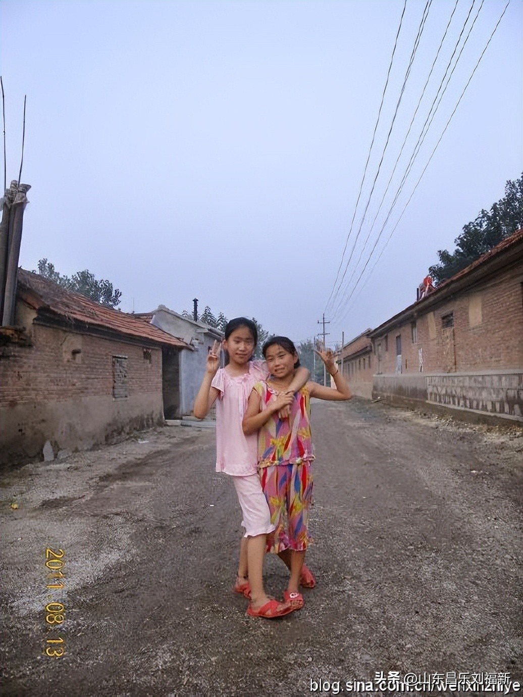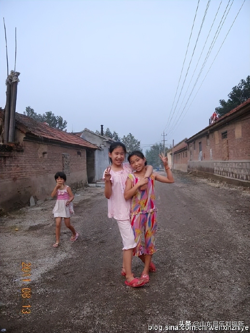 8、这是一条比较重要的东西街道,不论是古代、近代还是现代。是通往“母猪沟”、团埠坡、“北岩埠头”(赵家庄子、北岩街)和“水涧沟”(水沟涧村)的路。右边是原来的大队办公室,我父亲的家也在这里。正要到福田大哥家看望大娘(我的大爷刘明文在我父亲那一辈排行老大,我父亲排老三,两位大爷和我父亲的乳名就是排着起的),遇到两个小姑娘,她俩要我给其拍照。我问弟弟是谁家的姑娘,弟弟说六汉X(第三个字忘记了)的孙女,是我们村“西头”那一股的,“汉”字后边是“成”字,“成”字后是“从”字,她俩是“从”字辈了,比我高一辈,我笑着说:“我得叫你俩小姑呢。”