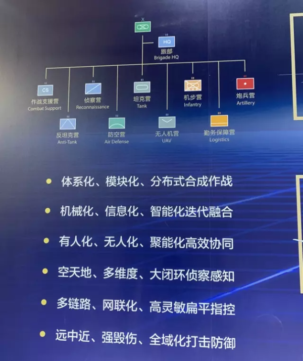 本次推出的合成旅系统包括11种不同的模块,分别涉及指挥中心、反坦克、防空、侦察、装甲、机步、炮兵、无人机、巷战增强、作战支援和勤务保障和等诸多作战模块。配套的一款基于八轮底盘研制的装甲侦察车,安装着战场探测雷达,激光红外和电视多通道光电探测系统,甚至还能携带小型无人机。一旦发现目标,即刻通过后台的战场数据链,将目标参数传递给炮兵营,快速实现信火一体,无缝衔接地精准打击。