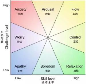 日常生活中,如果一件事情挑战性很强但我们的水平相对有限,那我们便会感到沮丧和焦虑。反之,如果我们的技能大大高于挑战,我们便会感到乏味无力。