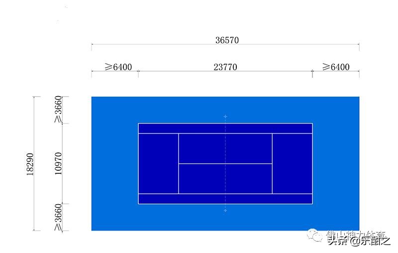 10、 一片标准网球场地的占地面积:长36.58米,宽18.29米,在这个面积内,有效双打主场的标准尺寸是:长23.77米,宽10.97米,在端线后应留有不小于6.4米的余地,在边线外应留有不小于3.66米。