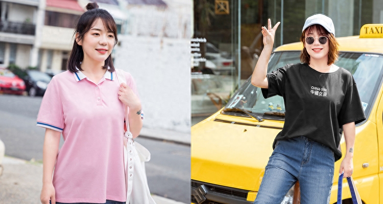 比如上图中,右边模特的T恤领型是圆领,肩部线条露出的空白会更多,如果你的肩部原本就宽厚,那这样打扮视觉上会加剧向外扩张。反过来,左图模特穿得是小V领的polo衫,将肩部线条隐藏起来,以此来弱化肩膀的实际宽度。加上V领纵向拉长了颈部的长度,在显瘦方面比圆领更有优势。