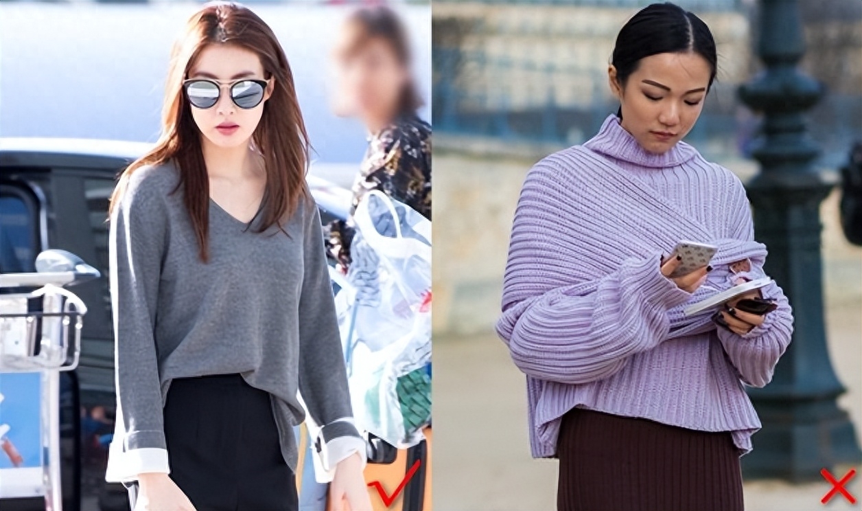 举个例子,右图中模特穿着堆堆领+斜向纹路的上衣,上半身的体积感横向延伸了一圈不止,量感看起来更大,苹果身材的女人要对这些元素避而远之。左图中的模特,则选择了宽松的V领上衣,不仅让线条显得干净利落,也能遮住身材的短板。