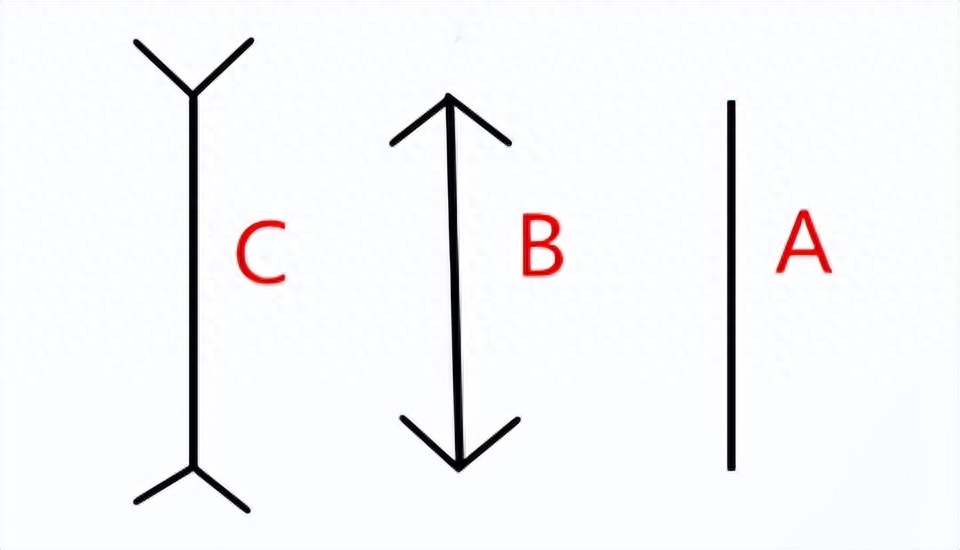 V领显瘦的原理,来自于著名的莱依尔错视原理。简单地说,像上图这3根竖线,哪根看起来最长?哪根看起来最短?答案分别是C和B。实际上,这3根竖线的长度是相同的,但为什么C看着就比B长呢?这其实是箭头拉伸和收缩带给你的视觉假象,也解释了V领为什么能显瘦。