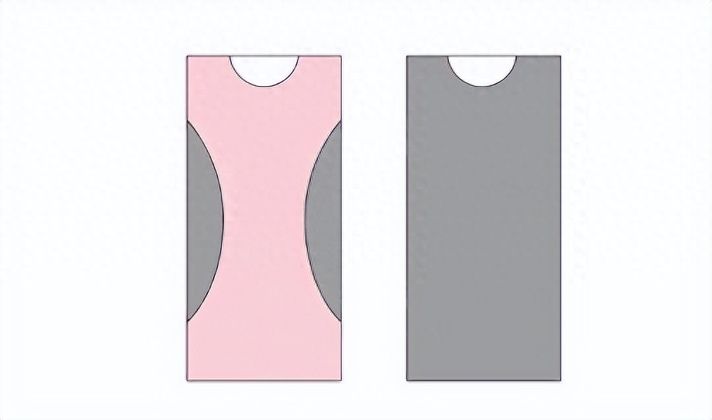 如图,我们把两个同体积的竖块当作人体,当左图两侧多出弧形的设计后,虽然真实的腰围没有变化,但很多人会把粉色这一块看成是你的腰围,这就是内收缩法的显瘦效果。