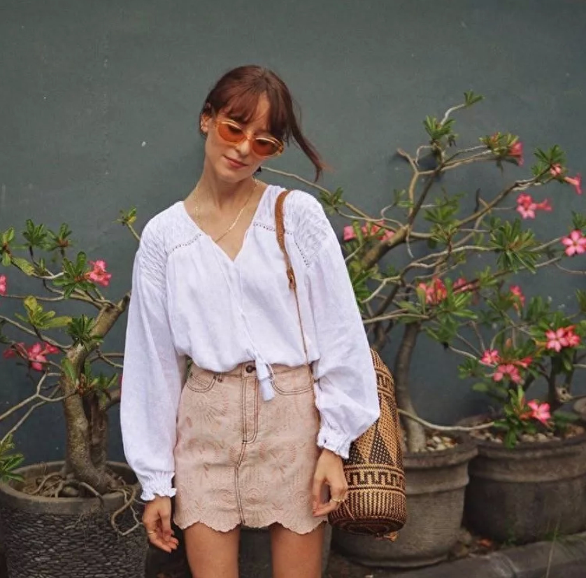 一些装饰性的元素,像泡泡袖、荷叶边、密集刺绣或印花等,因为本身就带有一定的量感,加上具有吸睛的作用,穿上后肯定会在视觉上产生横向膨胀的既视感。反过来,简洁宽松的上衣,能通过自然的垂感,有效遮挡宽肩膀和腰部,修饰身形线条。