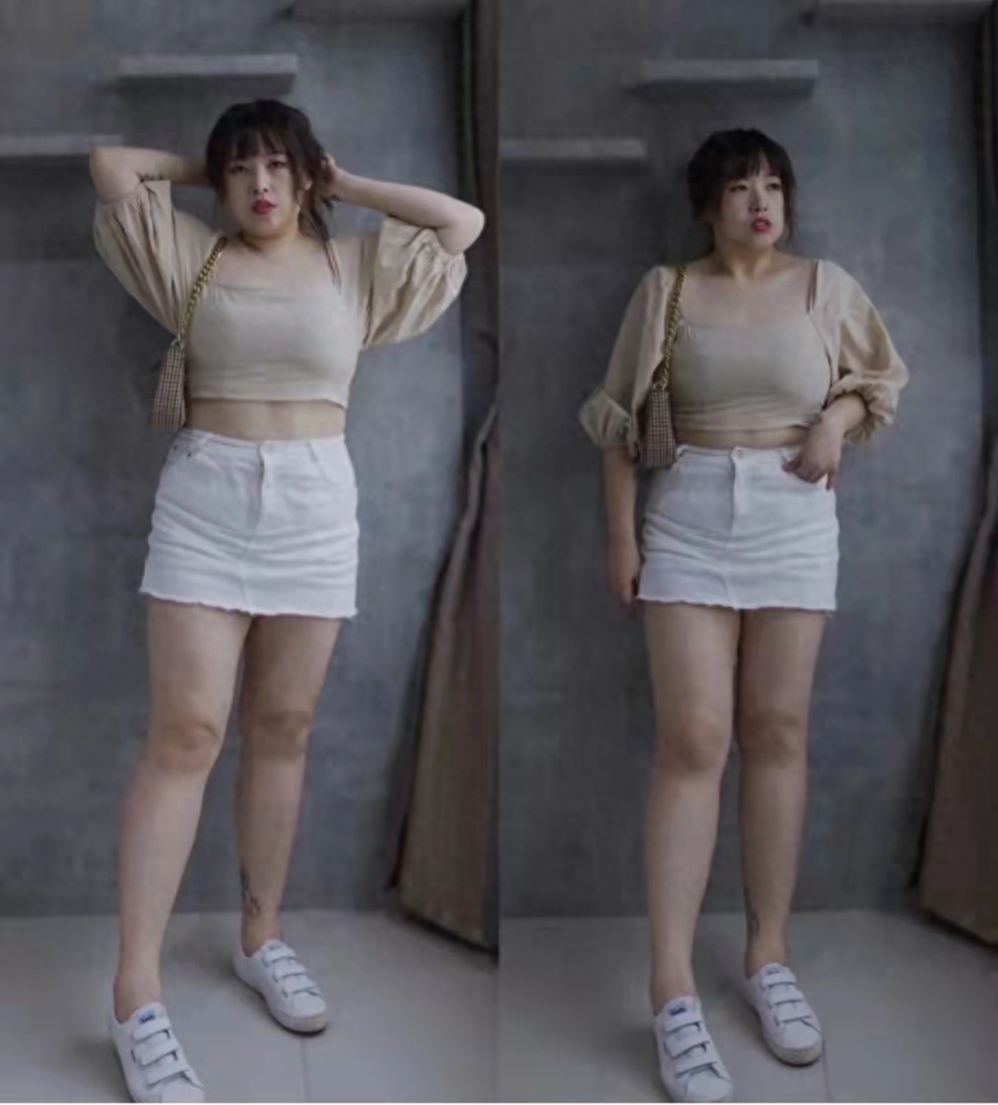 解决完上半身的劣势,再来说说怎么去突出下半身的优势。一般来说,我们可以利用自己的腿部优势或上简下繁的设计元素来引导视线位置的聚焦。将焦点位置尽可能地放在下半身,从整体上来讲,能一定程度上营造出纤细感。