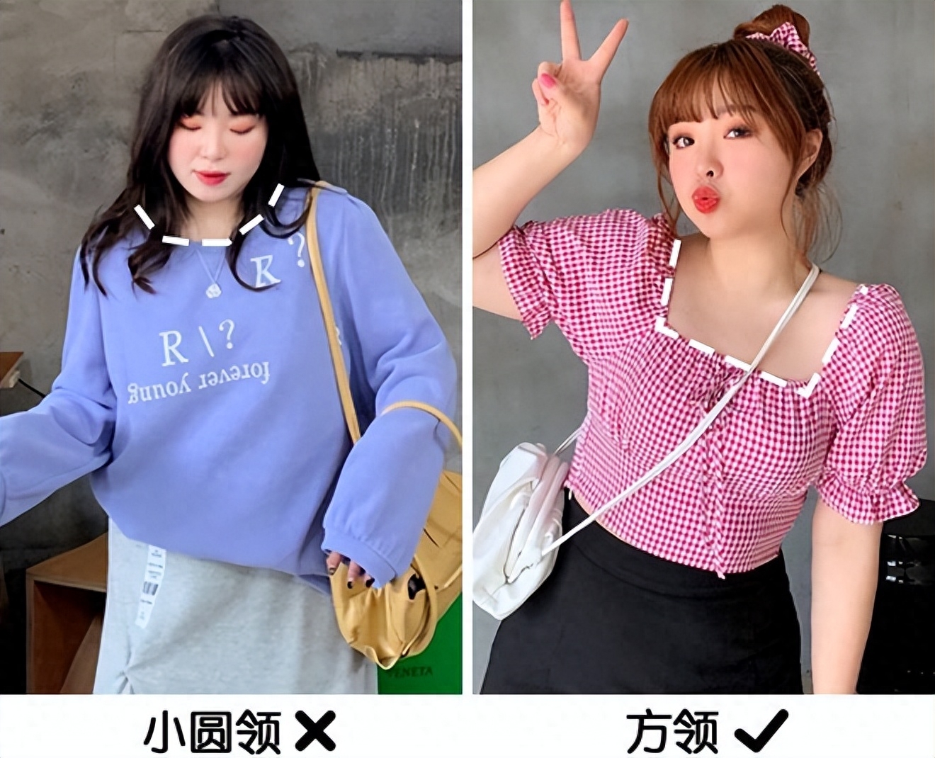 小圆领会让颈部看上去被隐藏起来,穿出来的感觉就像是没有脖子一样,换上方领款式的小上衣既露锁骨又不会露肩,这才是扬长避短的搭配方式。