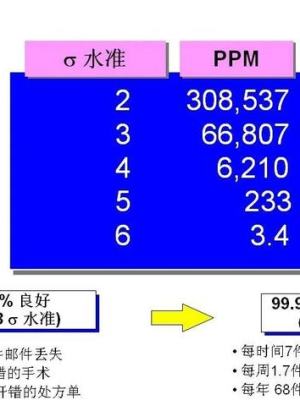 其含义引申后是指:一般企业的瑕疵率大约是3到4个西格玛,以4西格玛而言,相当于每一百万个机会里,有6210次误差。如果企业不断追求品质改进,达到6西格玛的程度,绩效就几近于完美地达成顾客要求,在一百万个机会里,只找得出3.4个瑕疪,即百万分之3.4(3.4ppm)。
