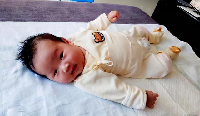 仰卧时,大人拉宝宝双手手腕总,宝宝头部能主动4天抬起;