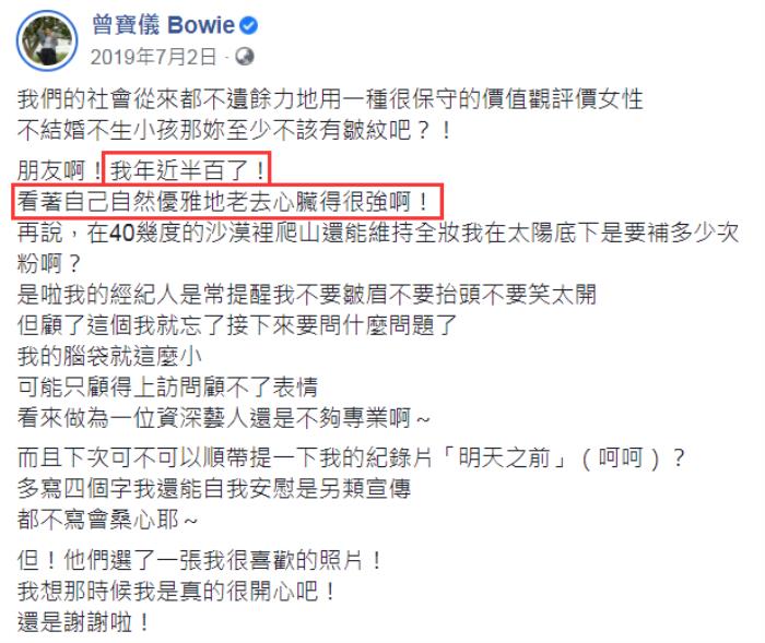 对此曾宝仪也大方发文回应表示“我们的社会从来都不遗余力地用一种很保守的价值观评价女性,不结婚不生小孩那你至少不应该有皱纹吧。”