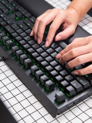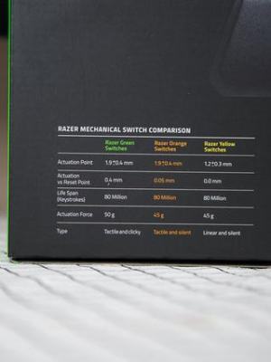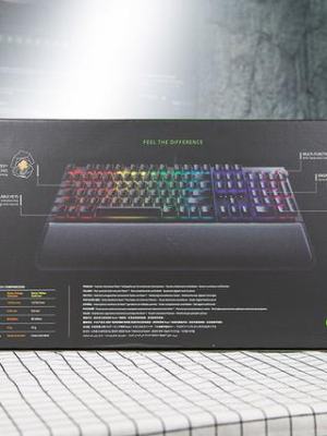 包装依旧是熟悉的黑绿配色,包装设计上有老版黑寡妇的影子,依旧保留了开窗设计,方便对于新玩家去线下尝试一下手感。其实对于老玩家也建议先尝试一下的。毕竟这款键盘的三个轴体都是雷蛇自主研发的,和Cherry的原厂键盘轴体在手感、声音、键程、触发点上还是有不小区别的。