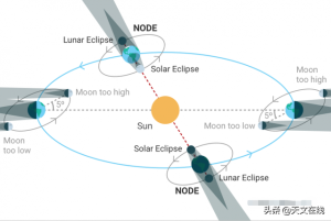 图解:接近地球公转轨道(黄道)月球公转轨道(白道)交点,黄白道交点是月球轨道与地球运行的黄道的交点。