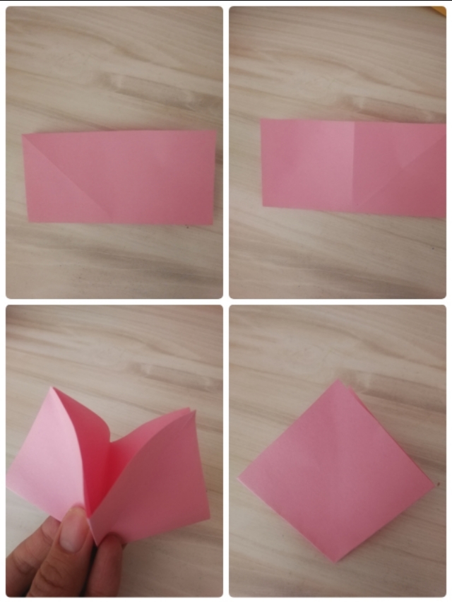5.对折,展开再对折,夹住两边往里对,再变成小点的正方形。