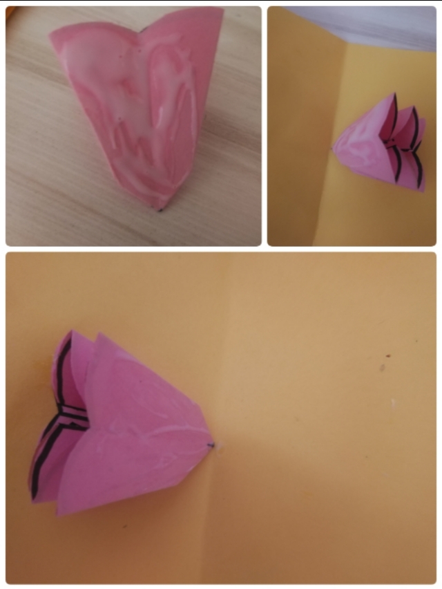 9.如图抹上胶,打开黄色的卡纸,粘到两边。